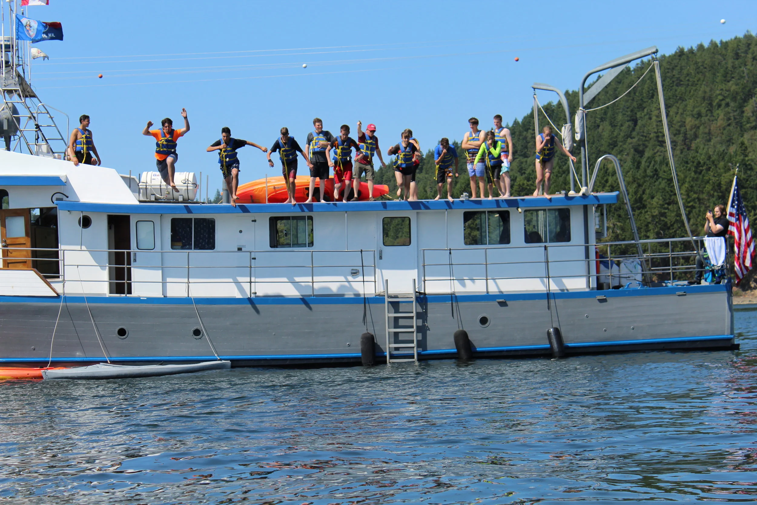 Once in Montague, the kids were buzzing around as everyone was getting ready to jump off top side. It’s a loved tradition that happens every cruise. The kids put their life vests on, climb up, and get ready to jump and meet the cold water.